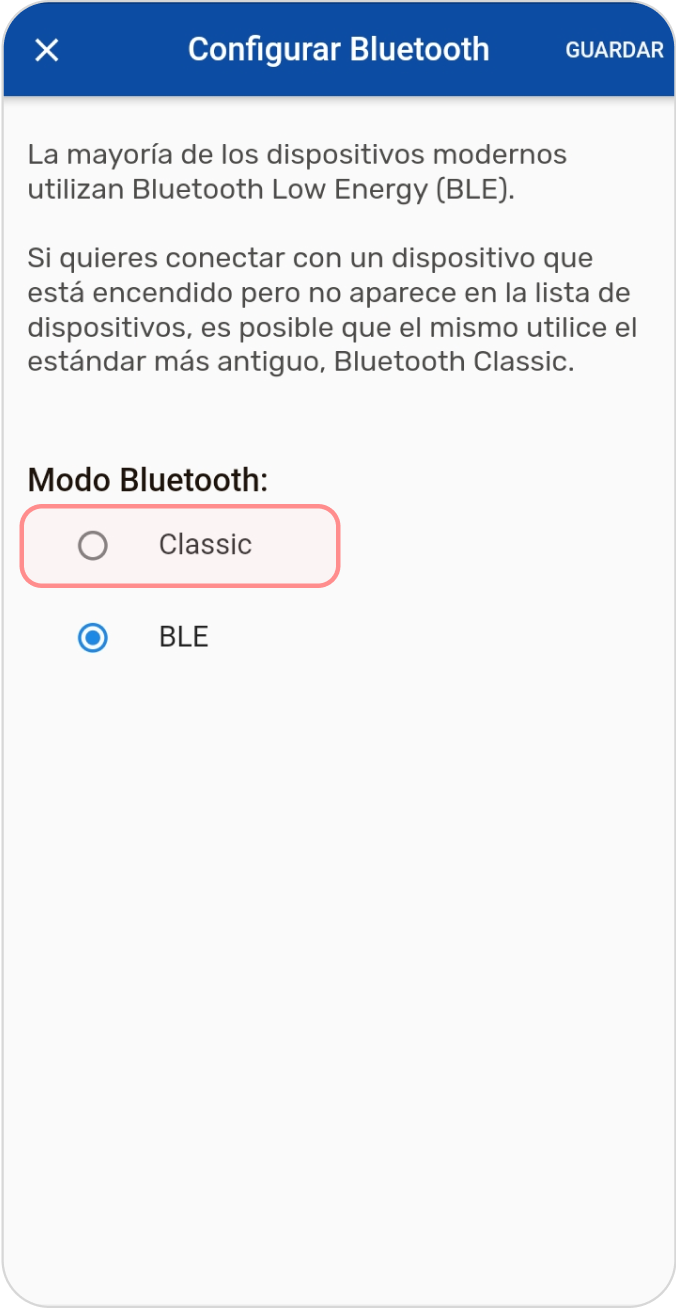 Si sospechás que tu lector puede tener un Bluetooth más antiguo, te sugerimos probar con la opción Classic que te ofrece la siguiente pantalla. Guardá los cambios para volver a intentar la conexión.