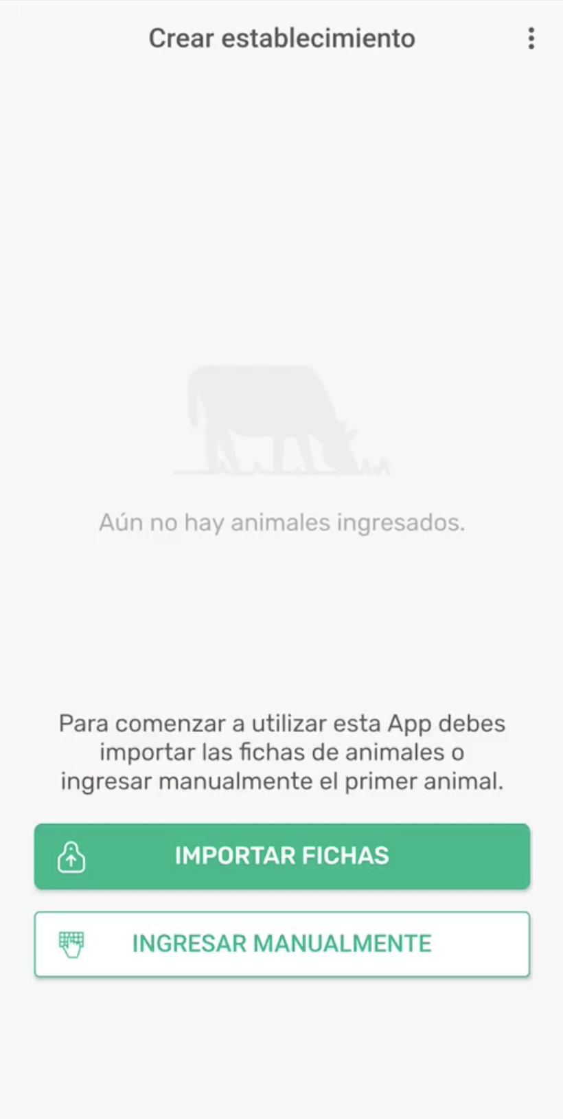 La opción Importar fichas solo es posible usarla con el archivo .csv proporcionado por MU (ver ”Generar un archivo para importar en MU App”). Si no lo tenés, MU App te da la opción de hacerlo manualmente (ver: Agregar animales y establecimiento manualmente).