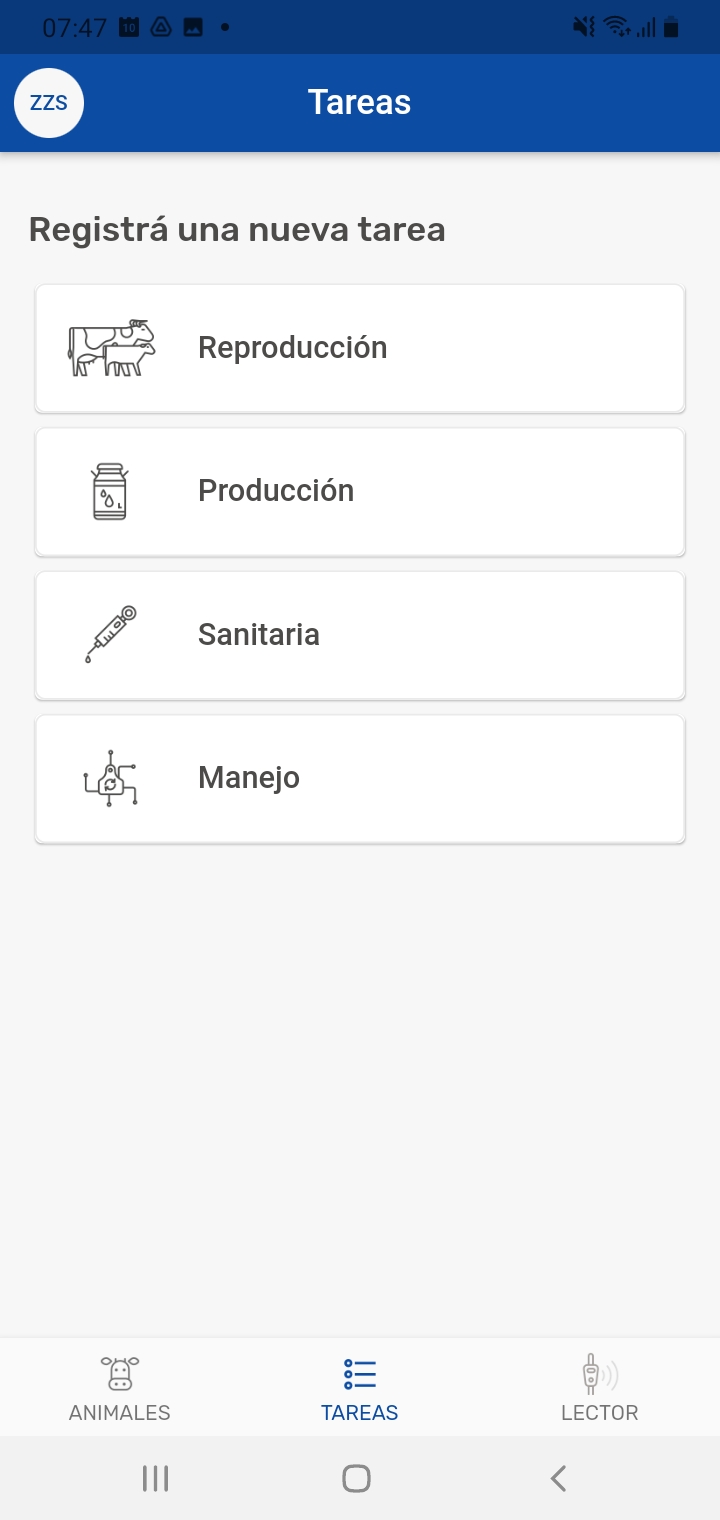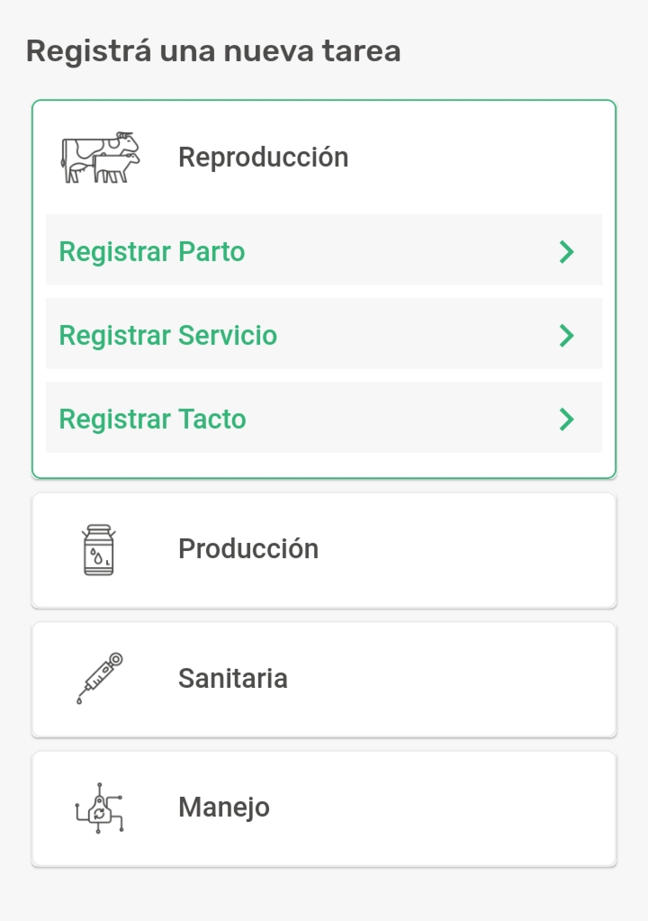 Las tareas disponibles son: “Registro de Parto”,“Registro de Servicio” y "Registro de Tacto".