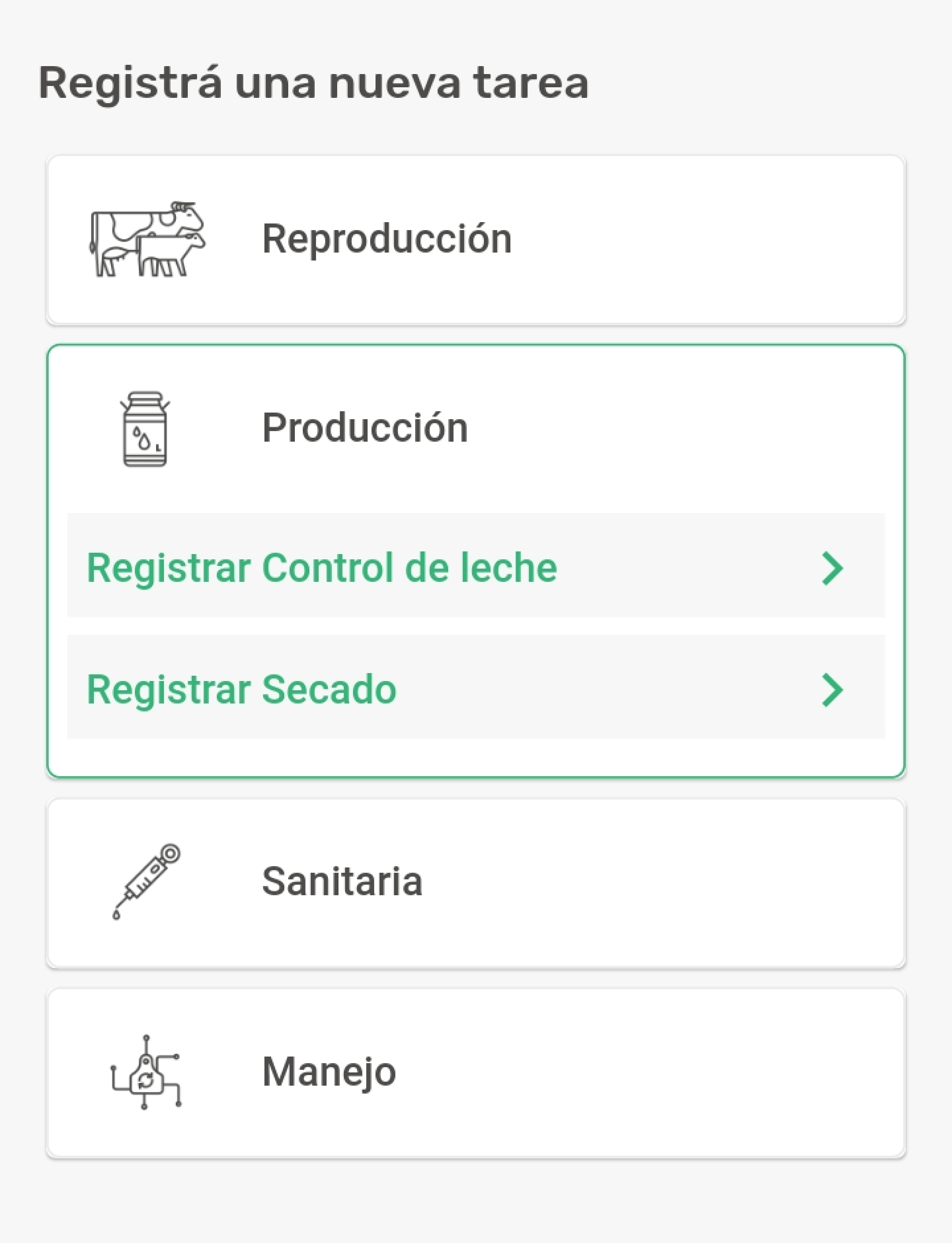 Las tareas disponibles son: “Registro Control de Leche” y “Registro de Secado”.