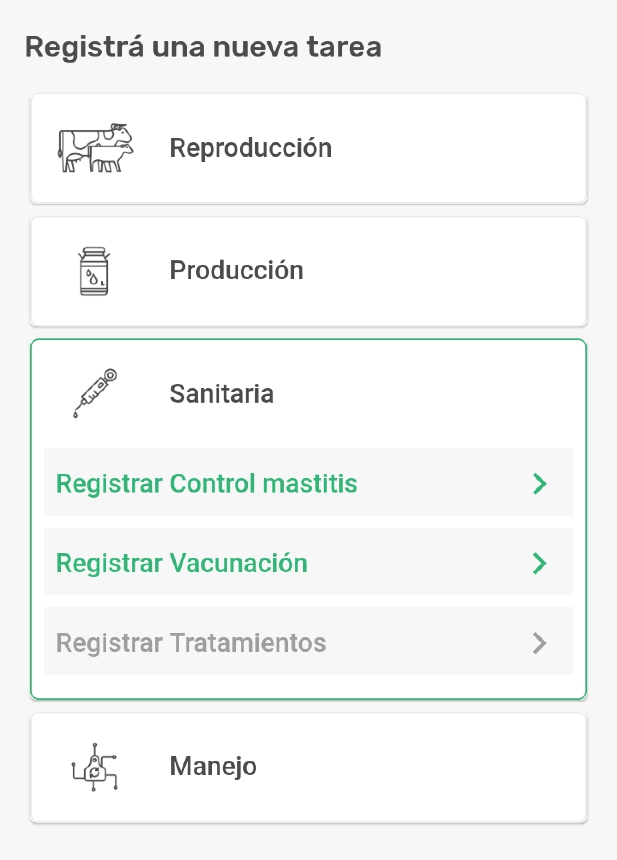 Las tareas disponibles son: “Registrar Control Mastitis” y “Registrar Vacunación”.