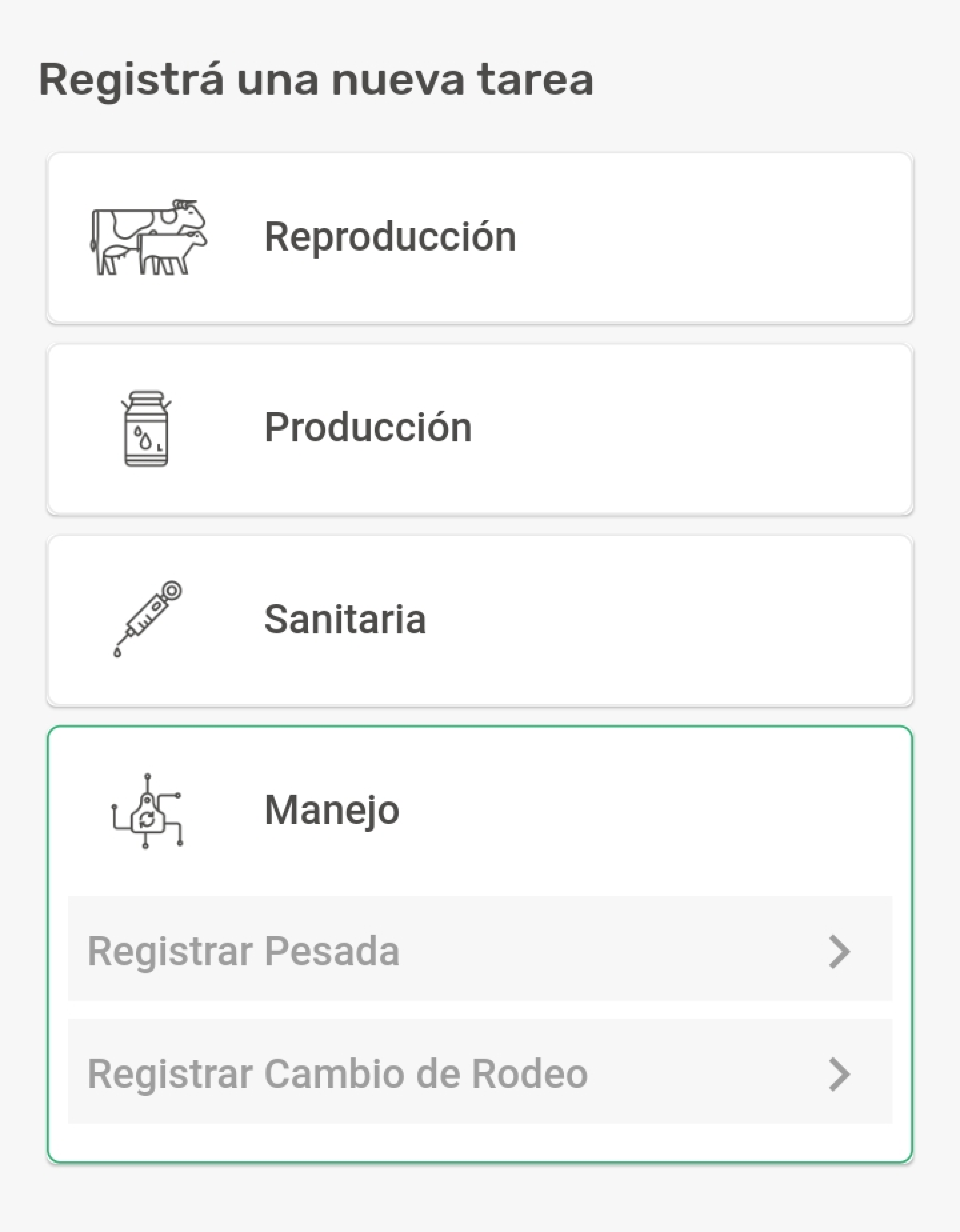 Tareas de Manejo: utilizada para registrar información relacionada a la gestión y seguimiento del animal de forma general. Estas funcionalidades estarán operativas próximamente en MU App.