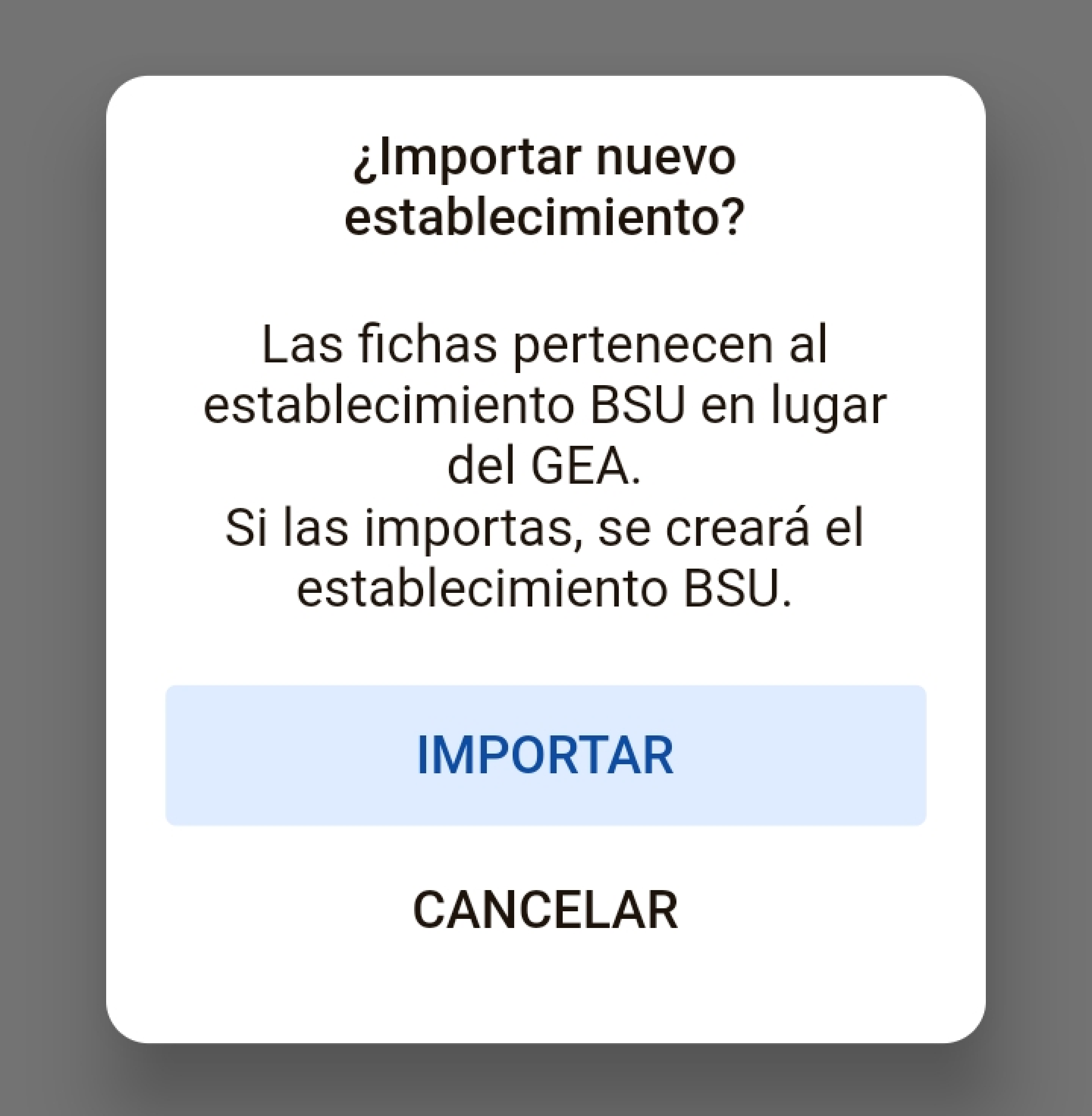 Si la aplicación detecta que estás subiendo un .csv perteneciente a otro establecimiento, te mostrará el siguiente diálogo. Si estás de acuerdo en crear otro establecimiento a partir de las fichas que estás importando, seleccioná la opción “Importar”.