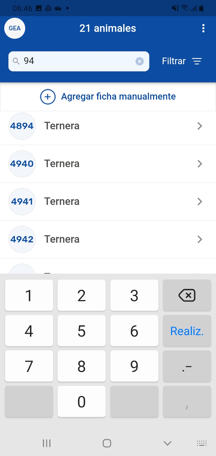 Si querés localizar un animal según su RP o Caravana, podés hacerlo escribiendo el número en el campo de búsqueda ubicado en la parte superior de la lista de animales. Se desplegarán los animales que corresponden con la secuencia de dígitos ingresada.