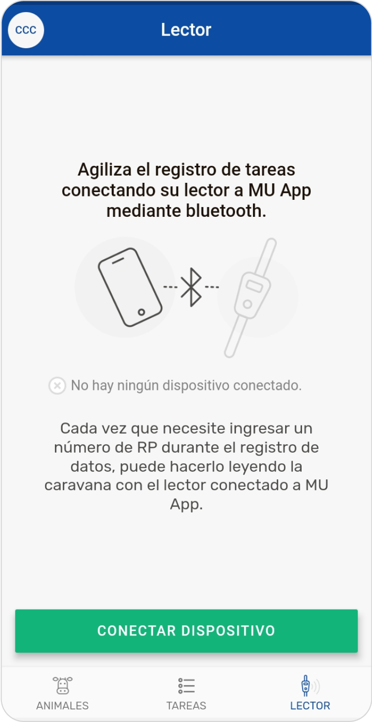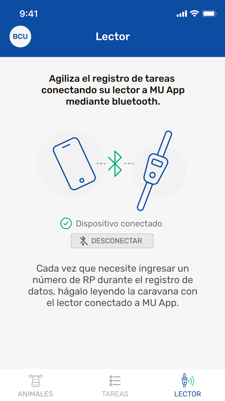 En MU App podés conectar el lector de caravanas que utilizás habitualmente para agilizar el ingreso de fichas de animales durante la realización de una tarea.