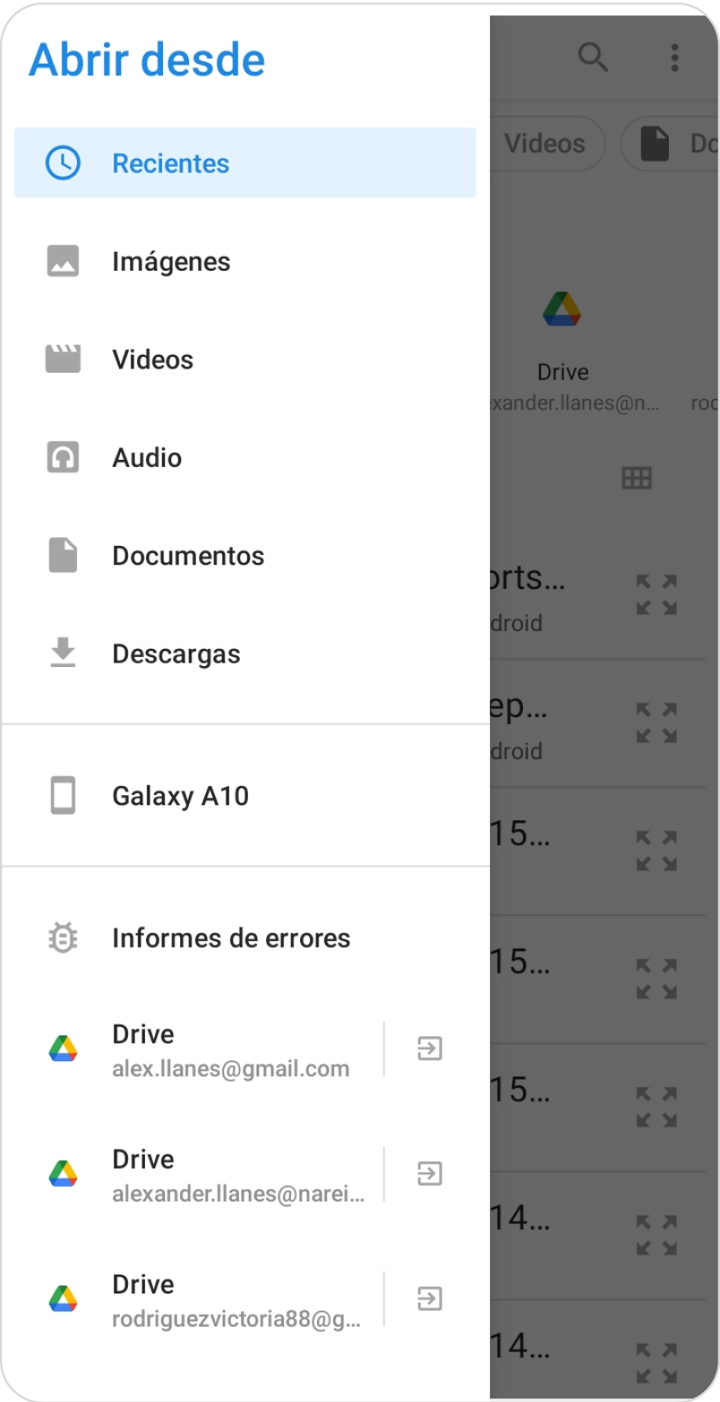 Si estás en un teléfono Android, se mostrará una vista similar a esta, y probablemente tu archivo esté alojado en la pestaña “Recientes” > “Documentos” > “Descargas”.