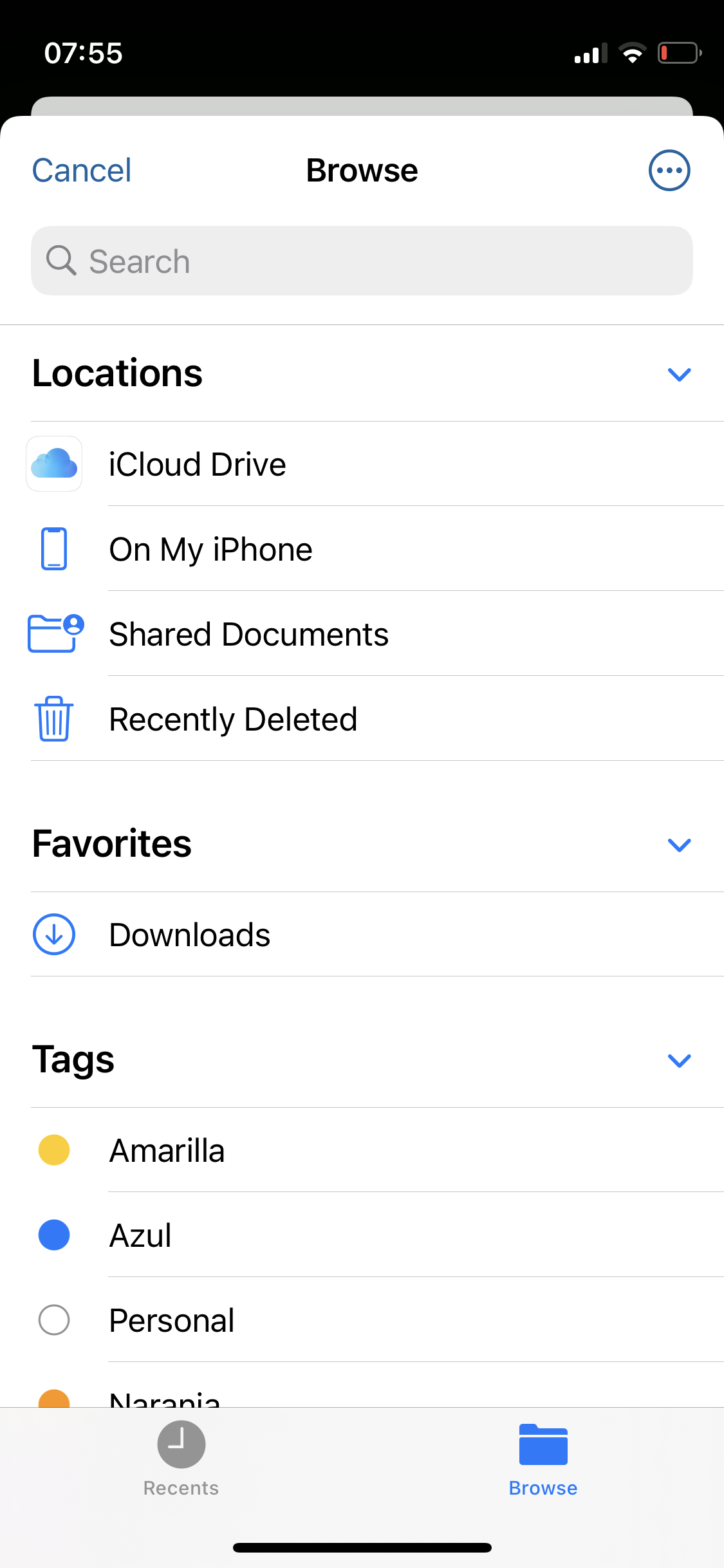 Si estás en un teléfono iOS, se desplegará la siguiente vista que te ofrece seleccionar un archivo reciente. Si acabas de descargarlo desde el email, estará en la pestaña Descarga.