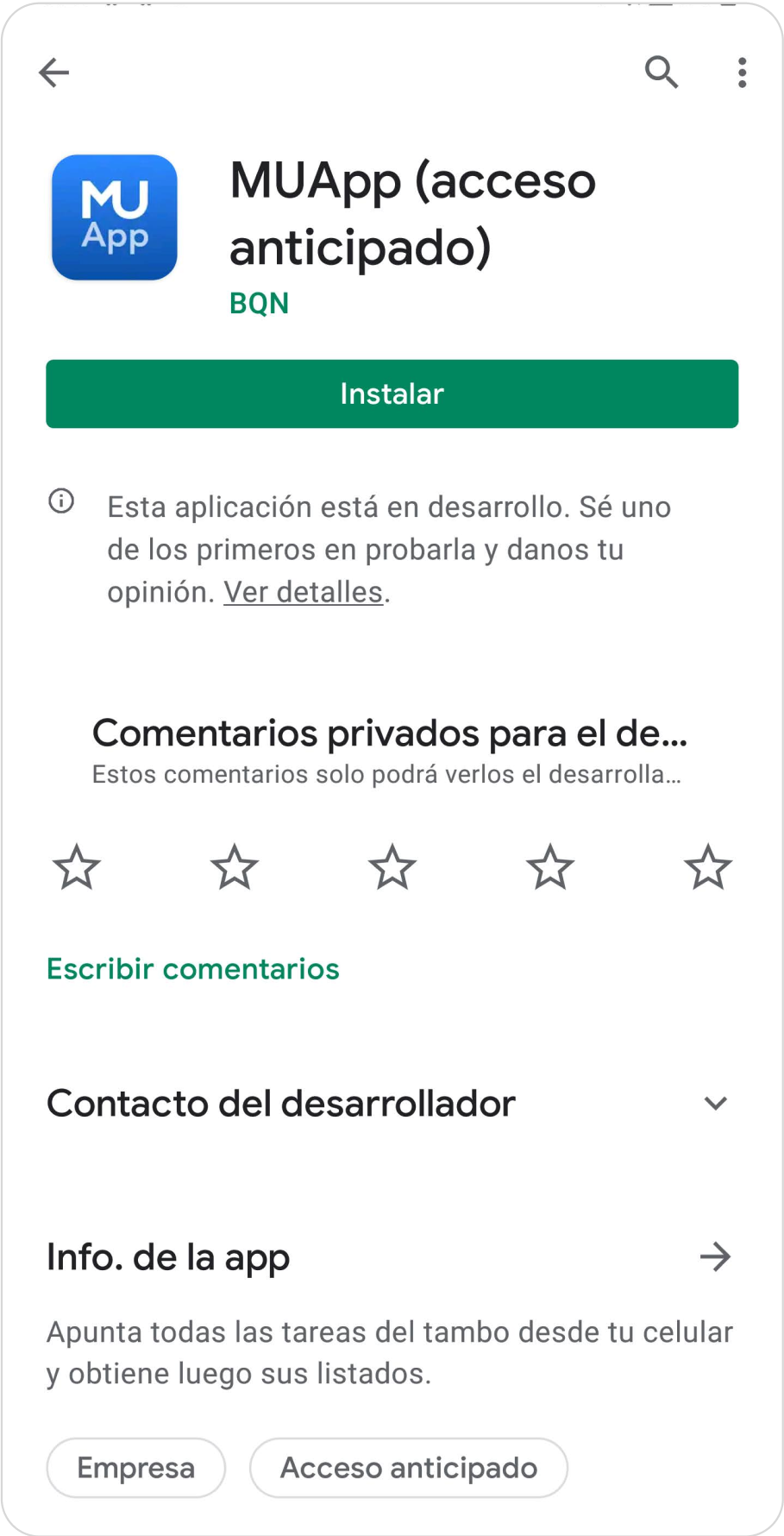 Accedé al Google Play desde tu teléfono y buscá “MUApp” en el buscador (sin espacios). También podes encontrarla accediendo a este link: link a store
