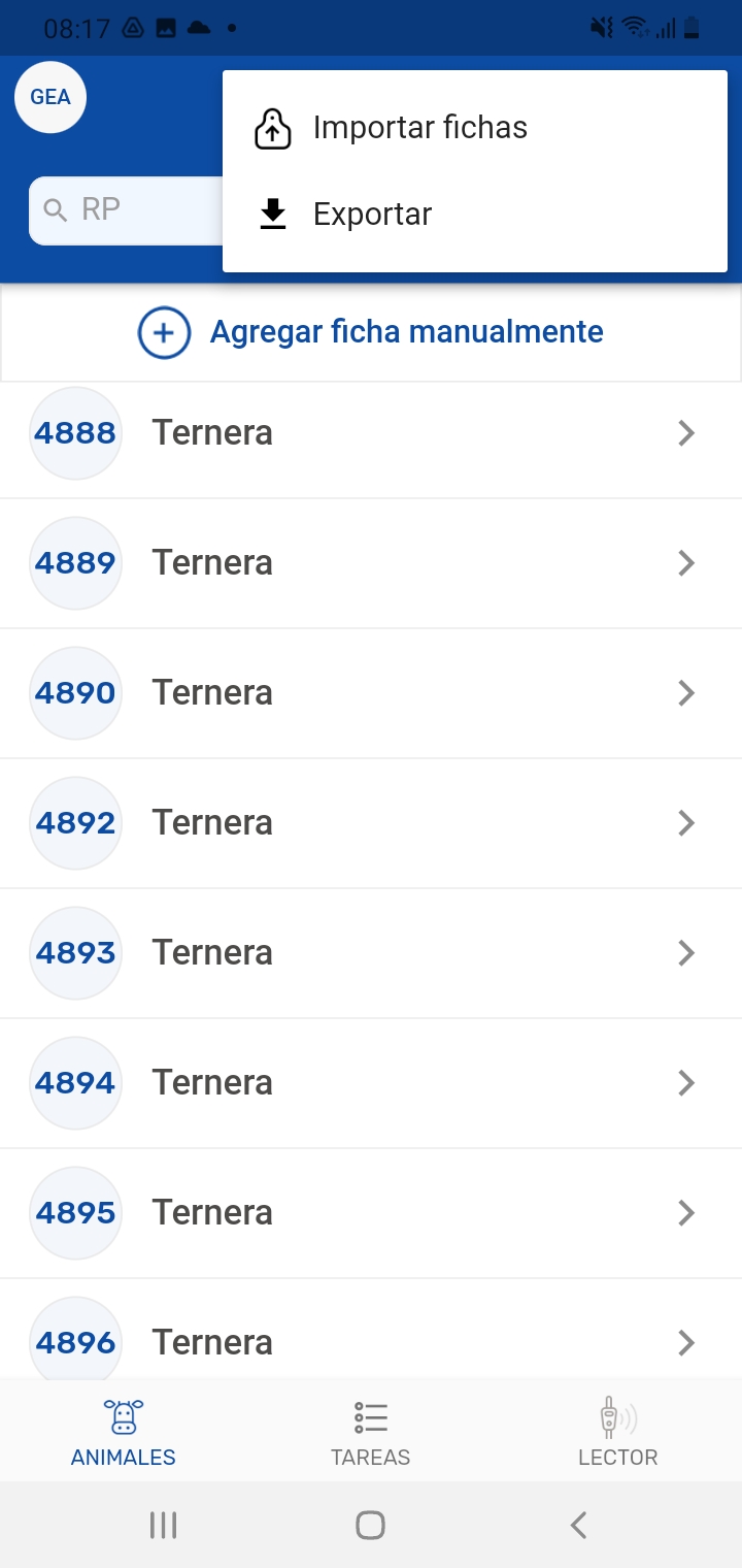 Al finalizar la re-importación de fichas, la aplicación mostrará los animales con las nuevas fichas.