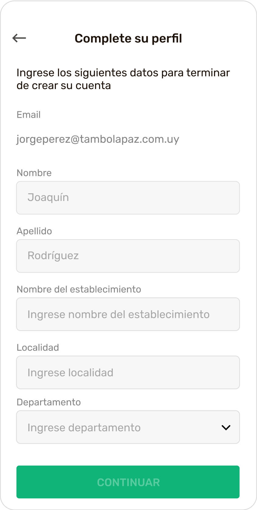 A continuación, una vez dentro de MU App, ingresá unos datos básicos relacionados a tu establecimiento para completar tu registro. Cuando los completes, seleccioná la opción “Continuar”