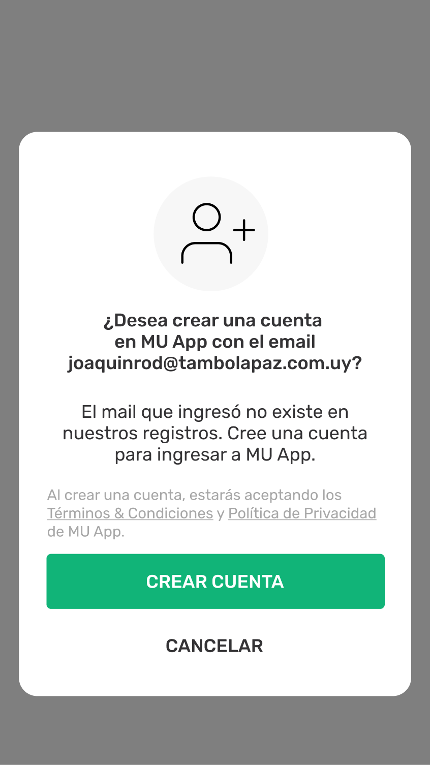 Por ser la primera vez que ingresas con ese email, MU App te preguntará si querés crear un usuario con ese email. Para continuar seleccioná la opción “CREAR CUENTA”